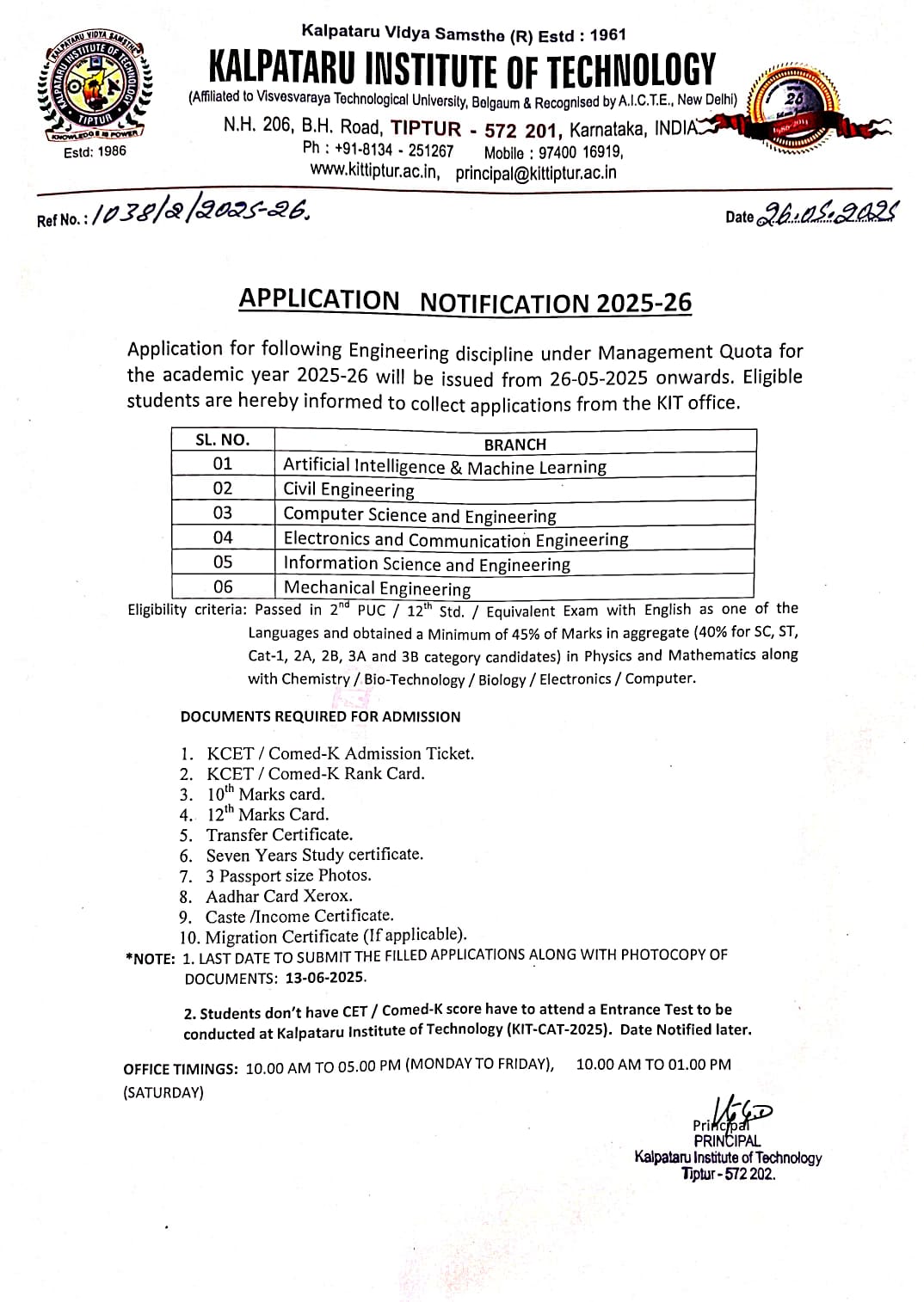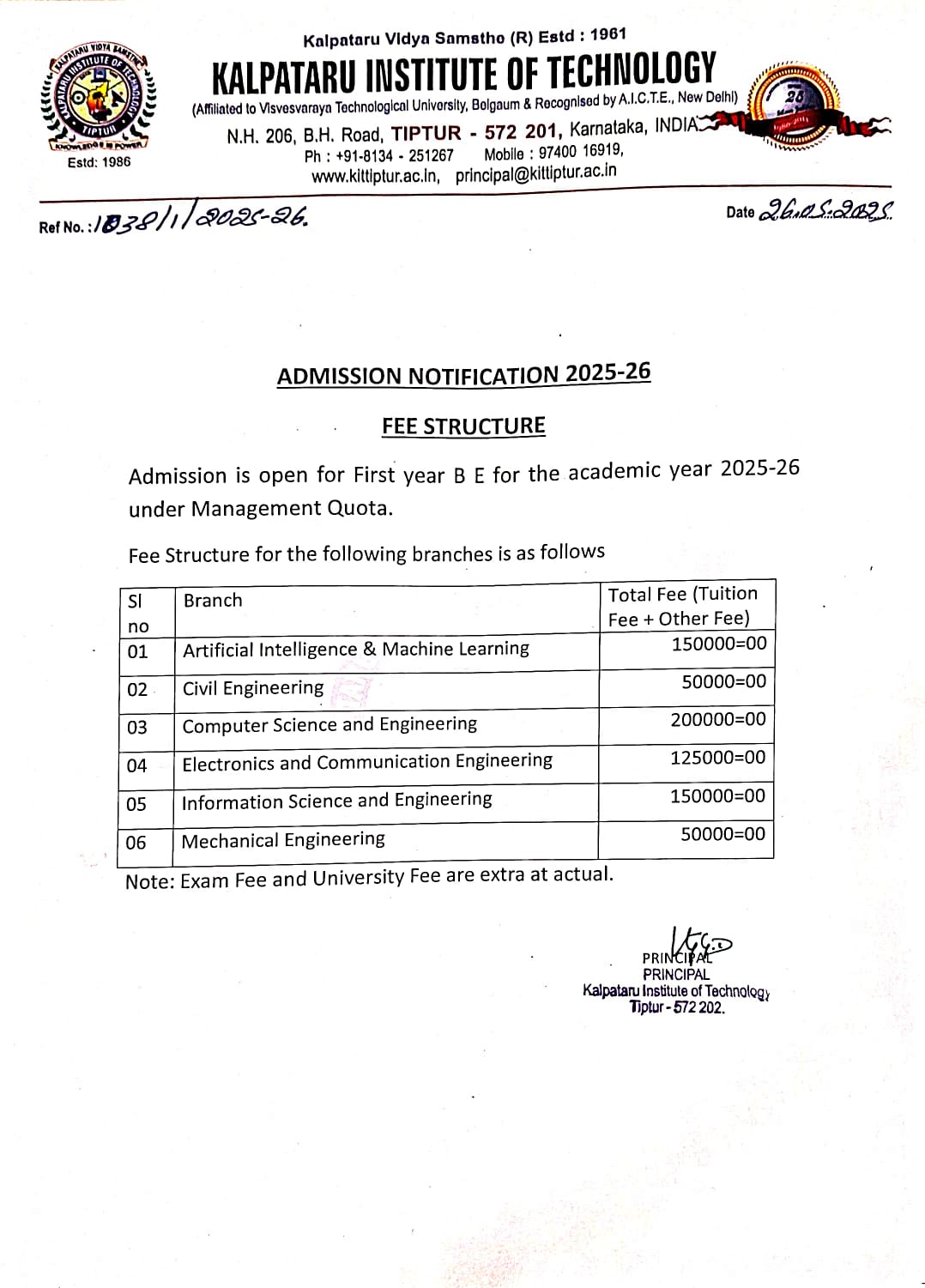 Admission for B.E. - CSE, AI&ML, ISE, ECE, Civil & Mech are open through Management, CET and Comed-K quota for the academic year 2025-2026.